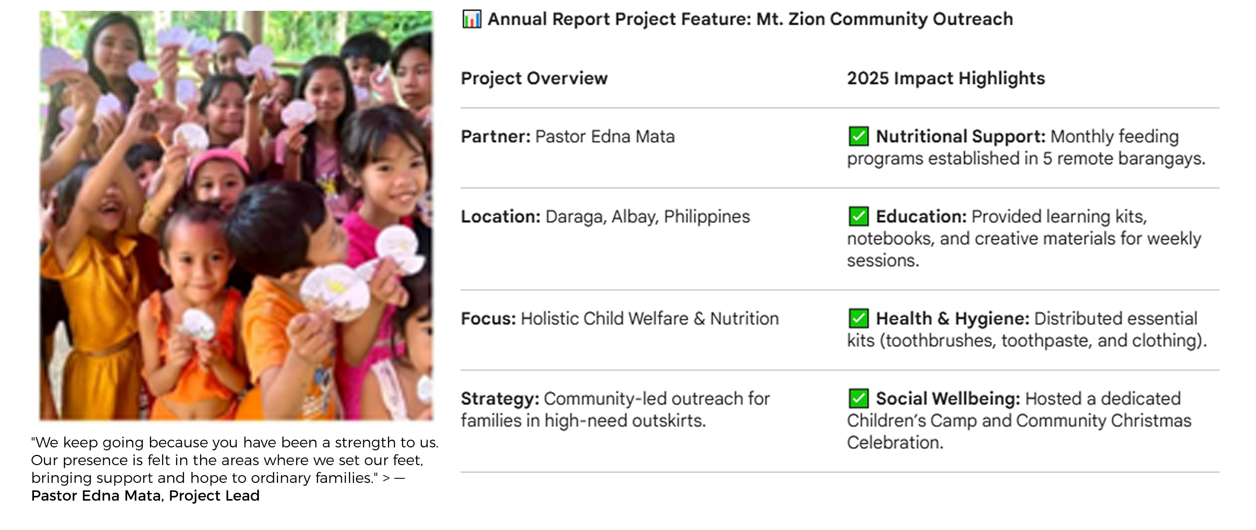 - THE PHILIPPINES: Our Student Nutrition Project focuses on combatting childhood stunting and malnutrition. By providing targeted feeding programs within schools and Early Childhood centers, we ensure that children are physically healthy enough to attend school, concentrate, and succeed in their studies. A legacy Project proudly sustained by our dedicated annual partners.